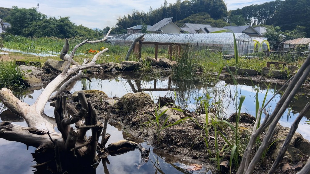 農園内には、生き物の避難場所や繁殖地となるビオトープ(池や湿地)を整備しています。さらに、水路・田畑・ビオトープを“つなぐ”ことで、分断されがちな水辺環境を再生し、生き物たちが移動できる生態系ネットワークを構築しています。