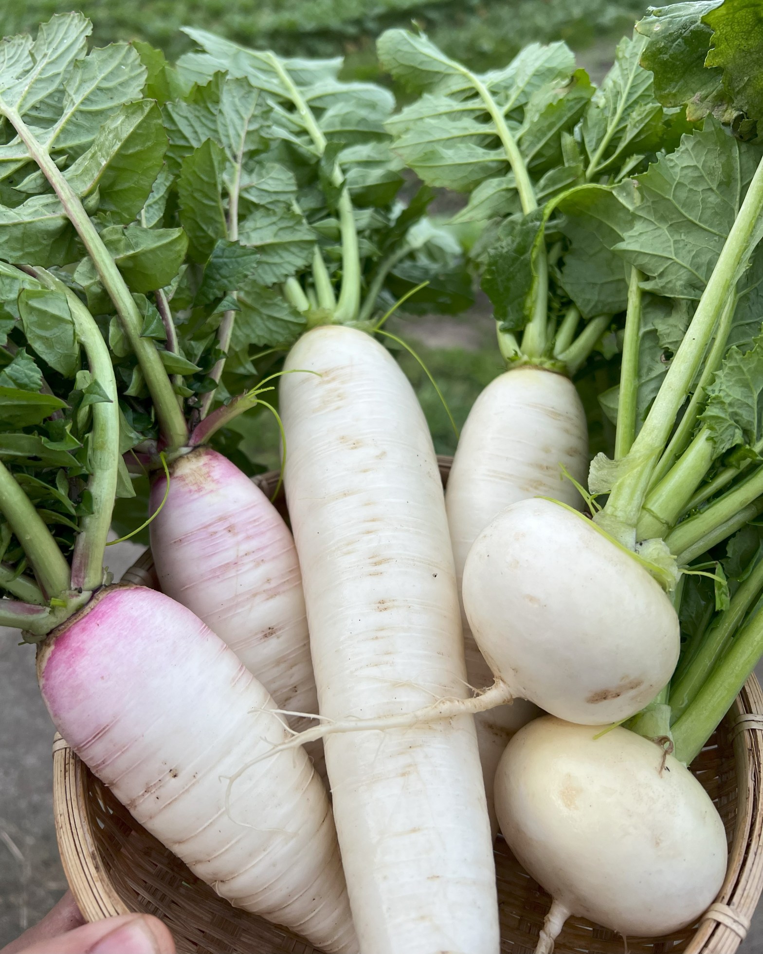 野菜の収穫体験ができる博多南自然体験ファーム。お試しで大根、あやめっ娘(上が赤い大根)、サラダカブを収穫!小さい大根鍋に入れるとほろほろになり過ぎて、生で食べた方がよさそうです笑