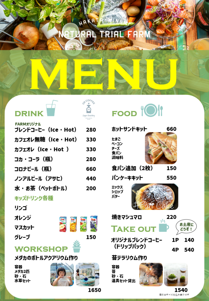 博多南自然体験ファームでは、納屋を改装し、カフェとしてもご利用いただけます。コーヒー豆は、佐賀県吉野ケ里町にある焙煎所OKcoffeeさんの豆を使用しております。