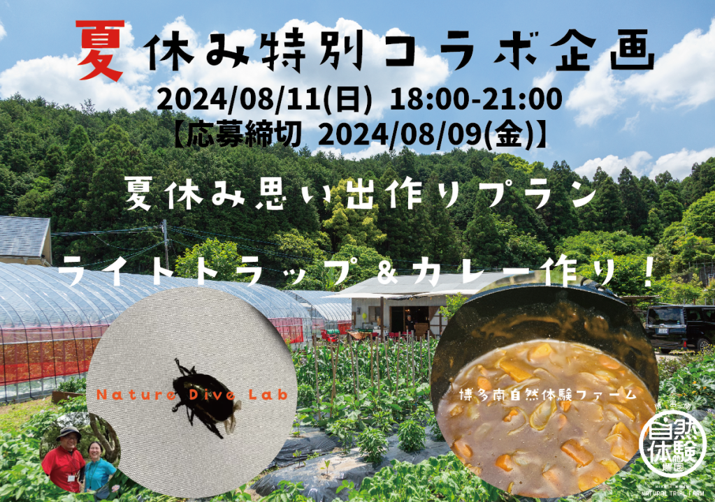 那珂川市を中心に、「自然・野生動物・海の生きものをテーマにした体験プログラム」を実施しているネイチャーダイブラボと、「生産者の気持ちが分かる体験農園」をコンセプトに、収穫した野菜をその場で味わえる博多南自然体験ファームがコラボ。ライトトラップで農園近くの山から集まる昆虫を観察しながら、自然の中で野外飯&プチキャンプ!ご家族一緒に夏休みの思い出作りに♪