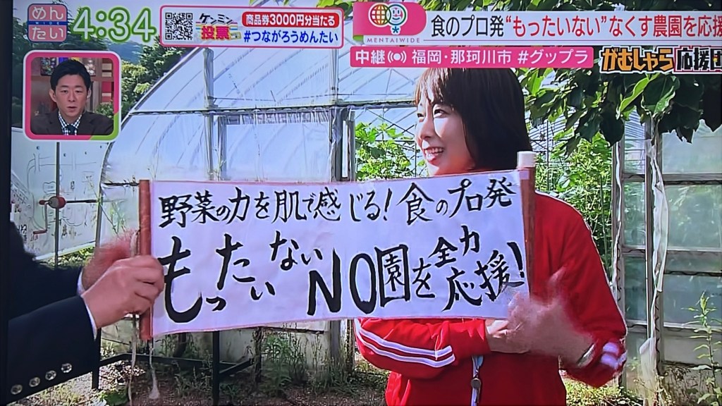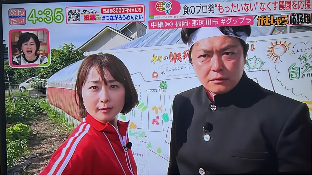 今回は日テレ系「Good for the planet」企画の内容での取材となりました。お笑い芸人土井上野の土井祥平さん、FBSアナウンサーの財津ひろみさんのお二人が那珂川市に来られて「もったいない」をテーマに、農園と那珂川市の生産者さんの規格外野菜の活用、ピザプラン、流しそうめんプランを紹介していただきました!